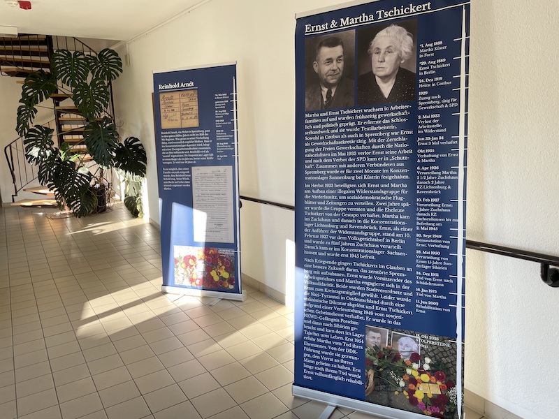 Bereits am Nachmittag konnte im Spremberger Rathaus die Ausstellung besichtigt werden, mit der an Verfolgte des Naziregimes erinnert wird. Die AG Spurensuche und das Bündnis #unteilbar Spremberg haben in Wort und Bild verschiedene Menschen porträtiert, die ab 1938 aufgrund ihrer Religion, politischen Überzeugung oder ihrer Lebensweise von den Nationalsozialisten verfolgt, gedemütigt, ins KZ deportiert und dort meist ermordet worden sind. Dabei sind unter anderem auch Ernst und Martha Tschickert sowie Reinhold Arndt, für die am 18. Oktober drei Stolpersteine auf dem Georgenberg verlegt wurden.