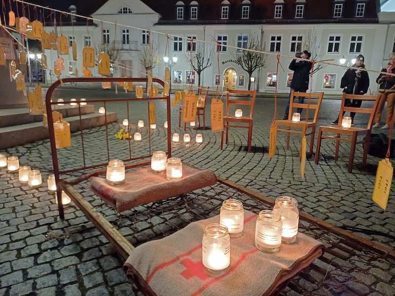 Mit einer Gedenkveranstaltung wurde am Sonntag, 9. November, auf dem Spremberger Marktplatz bisher bekannten verfolgten Personen, die im Nationalsozialismus in Spremberg/Grodk lebten oder aus Spremberg/Grodk stammten, gedacht. Seit 2021 gibt es jährlich dieses öffentliche Gedenken, an dem in diesem Jahr etwa 150 Sprembergerinnen und Spremberger teilnahmen.