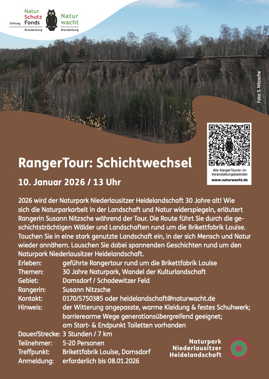 Anlässlich des 30-jährigen Bestehens des Naturparks Niederlausitzer Heidelandschaft lädt die Naturwacht Brandenburg am 10. Januar 2026 zur geführten Rangertour „Schichtwechsel“. Diese Wanderung blickt auf 30 Jahre Naturparkarbeit zurück und startet um 13 Uhr in Domsdorf. Die Rangerin führt die Teilnehmenden in die umliegenden Wälder sowie die Bergbaufolgelandschaft Schadewitzer Feld.