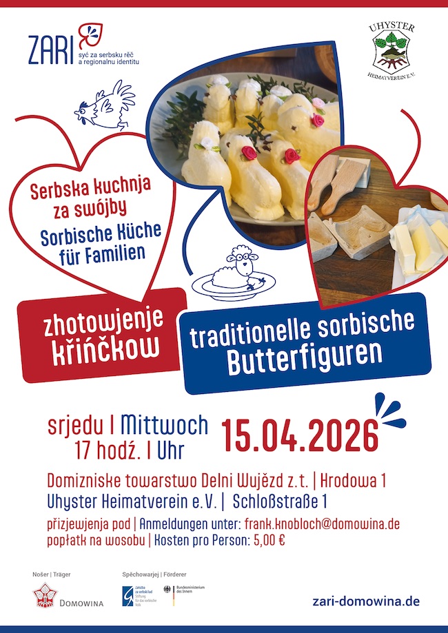 17:00 hodź. Serbska kuchnja za swójby “zhotowjenje křińčkow” w Delnim Wujězdźe (Domizniske towarstwo Delni Wujězd z. t.; Hrodowa 1) informacije poda po naprašowanju motiwator za serbsku rěč projekta ZARI, Frank Knobloch
